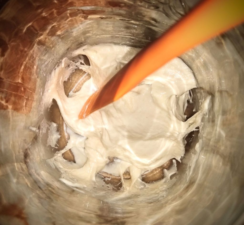 The white layer was watery, pasty, and had every indication of “do not keep me”. The beige layer beneath had a cake batter like texture and looked “healthier” even if this rich color is darker than the color of my normal starter.