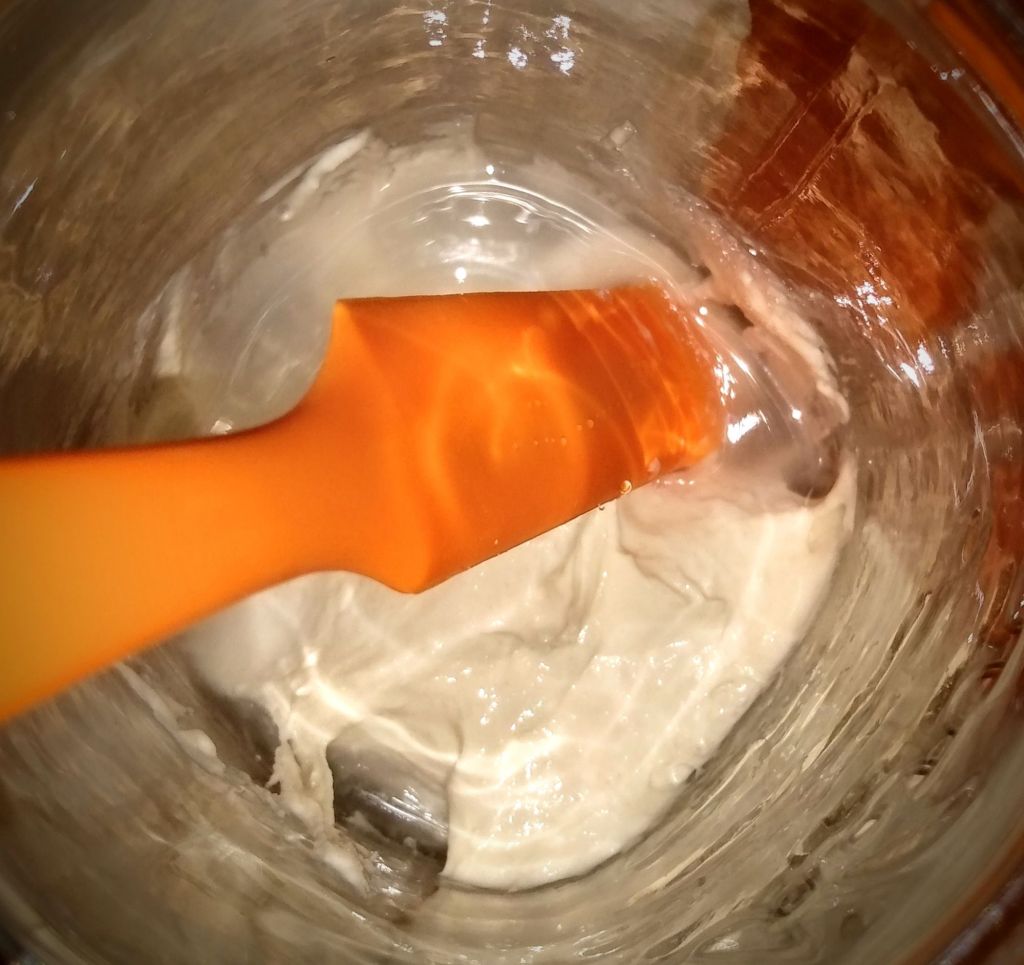 As you can see here, there is no doubt that my starter and water are fully incorporated. And it just takes a couple stirs, less than my eggs take when I scramble them.