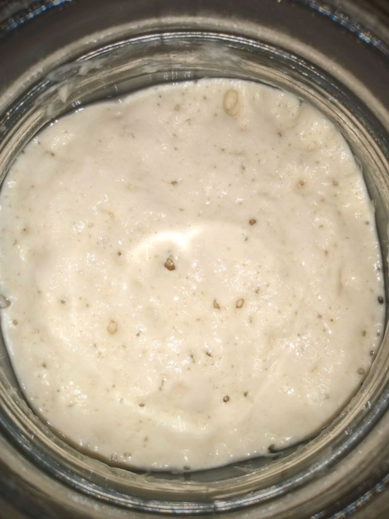 I took a picture of the top of the jar, with the only thing I did was remove the lid, so you could see that there was no hooch. There was no discoloration. This picture tells you nothing as far as smell. But it was predominantly the sour yeasty smell. BUT there was also a flour smell to it. You will notice this flour note when you first feed your starter because you have unprocessed flour in the jar. The fact that the yeast had grown and ate the flour, the smell of flour tells me that the yeast is still weak and the flour hasn’t been all eaten up. This doesn’t raise any red flags. It just tells me that I should expect my proofing to take longer than if my yeast is healthy and happy.