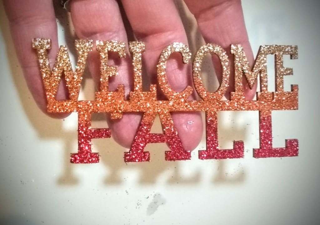 The only green glitter I had on hand was a lime green that I bought from a spring line of glitter. There was no way that I could make that Easter egg green work in a fall theme. So I grabbed my blue and purple glitters to blend a darker green. If you look closely at this picture, you might be able to pick up the different colors. Around the middle, you’ll see some grains of blue that has a turquoise to it. And then around the perimeter you see the darkness of the purple glitter.