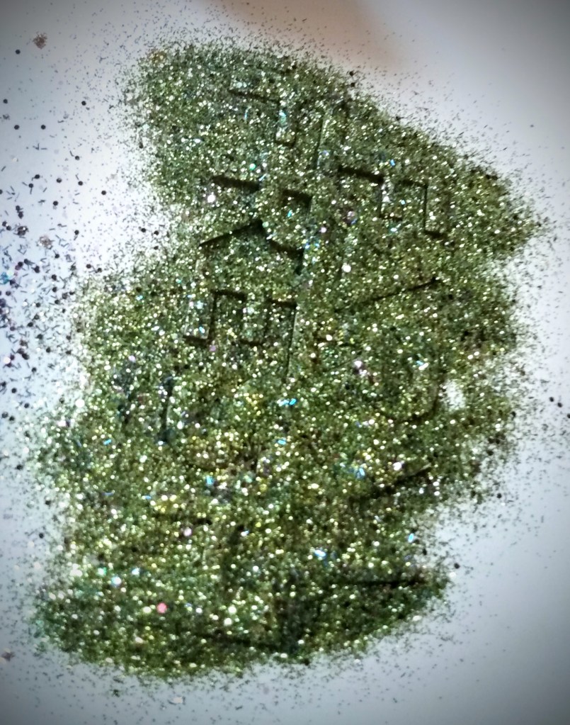 For the green that I made, I used the blue to take away the brightness of the lime. These two colors still have a fresh spring green color, so the addition of a darker color, like purple, makes the green dark. I didn’t use precise measurements. I added a little bit at a time so I don’t use my whole glitter stash and run out of colors to make corrections. Over all, it came down to the ratio of the lime taking up 50-60%, blue 30-40%, and purple 10-20%
