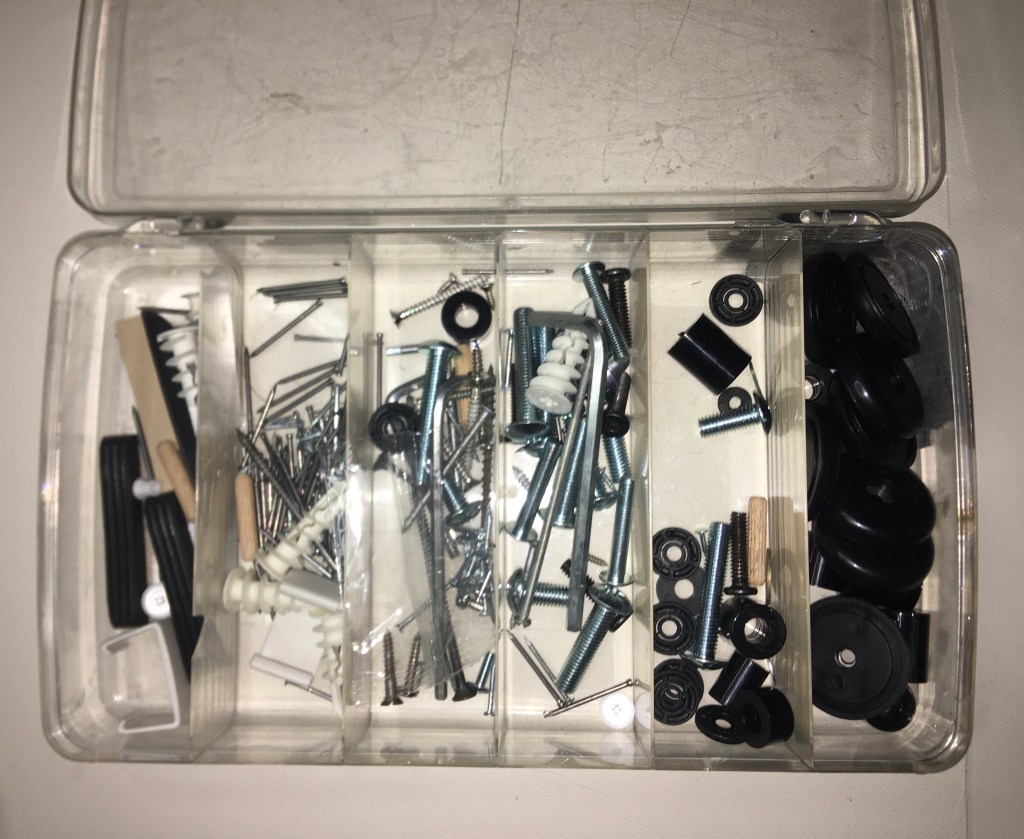 This box divider is my BEST friend. In fact I have a few variations of this. I forget where I bought this 11 x 6.5 x 1.5 inch plastic box. But I’ve very certain this was orginally packaged and sold for storing cake decorating supplies. At least that is what I kept my tips, connectors, and bags in when I took a cake decorating class before I met my husband and made my last move. As you can see, I found a new home for my cake decorating and put my household fix it items here. This is where I keep all my exta pieces from IKEA build it yourself items, my dry wall screws, nails, screws, washers, allen wrenches (before this I could never find those bad boys when I needed them) and left over components to my bed frame. This type of set up made my last big move (after marrying my husband) an absolute breeze. I didn’t lose my washers and screws for my canapy frame. They were all there and ready for assembling when we arrived. Plastic bags always get lost in a move. But a good storage container like this, keeps things organized and easier to find in a room that’s filling up with opened boxes and fill.