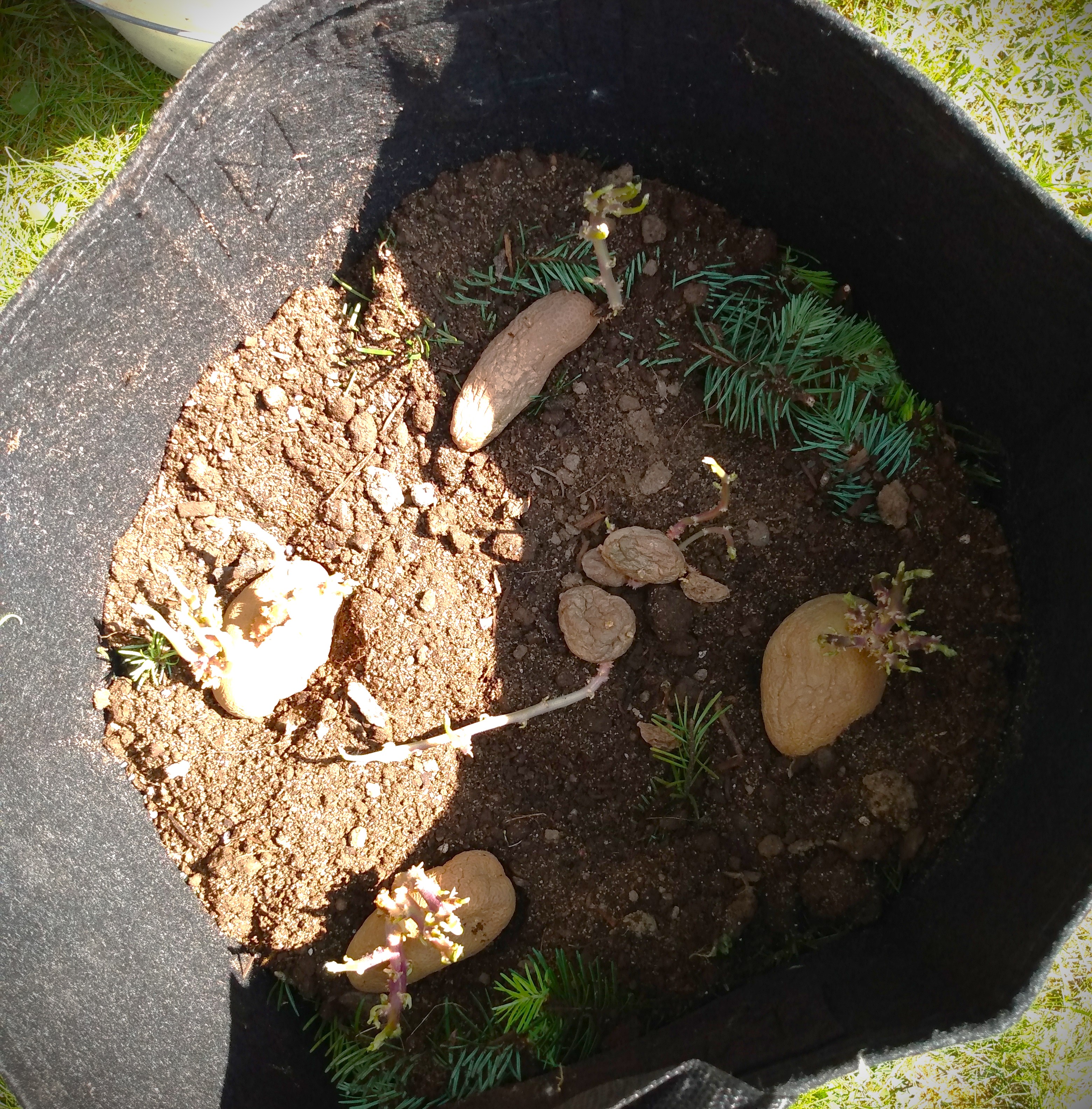 The pine branches and fronds were added primarily for slow release nutrition for my potato plants. But I placed them in the grow bags, like other growers place hay, because the thick layer of fronds (theoretically) gives them the tubers the ease of growth without the soil compounding around them from watering and rains.