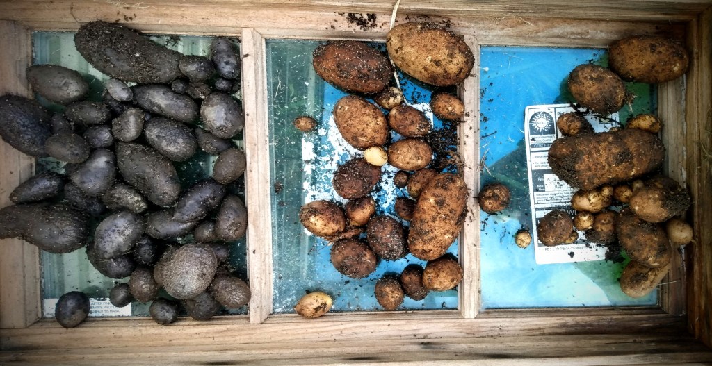 What I learned between the different varieties of potatoes is that I need to get some more different varieties and try them out to see if there are other potatoes that will grow better for me, like the purple ones grew better for me.