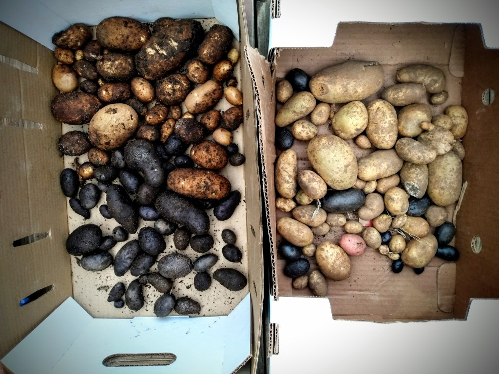 The purple potatoes outperformed the russet potatoes in quantity and overall size. This surprised me the most.