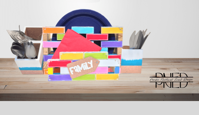This accommodates 9″ paper plates and standard sized napkins. In the picture are 9″ plates and cocktail napkins (6.5″). The dimensions can be adjusted according to your family needs.
