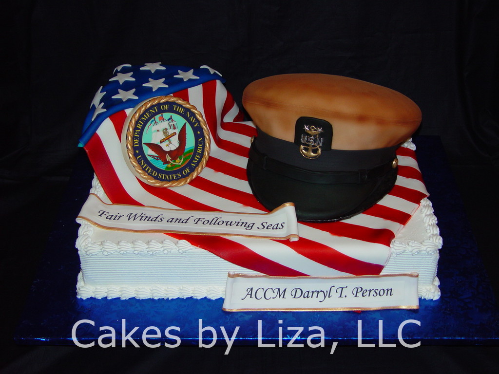 Navy Retirement Cake. Inspiration cake and my cake with the medalion that was placed against the center wave in the flag.