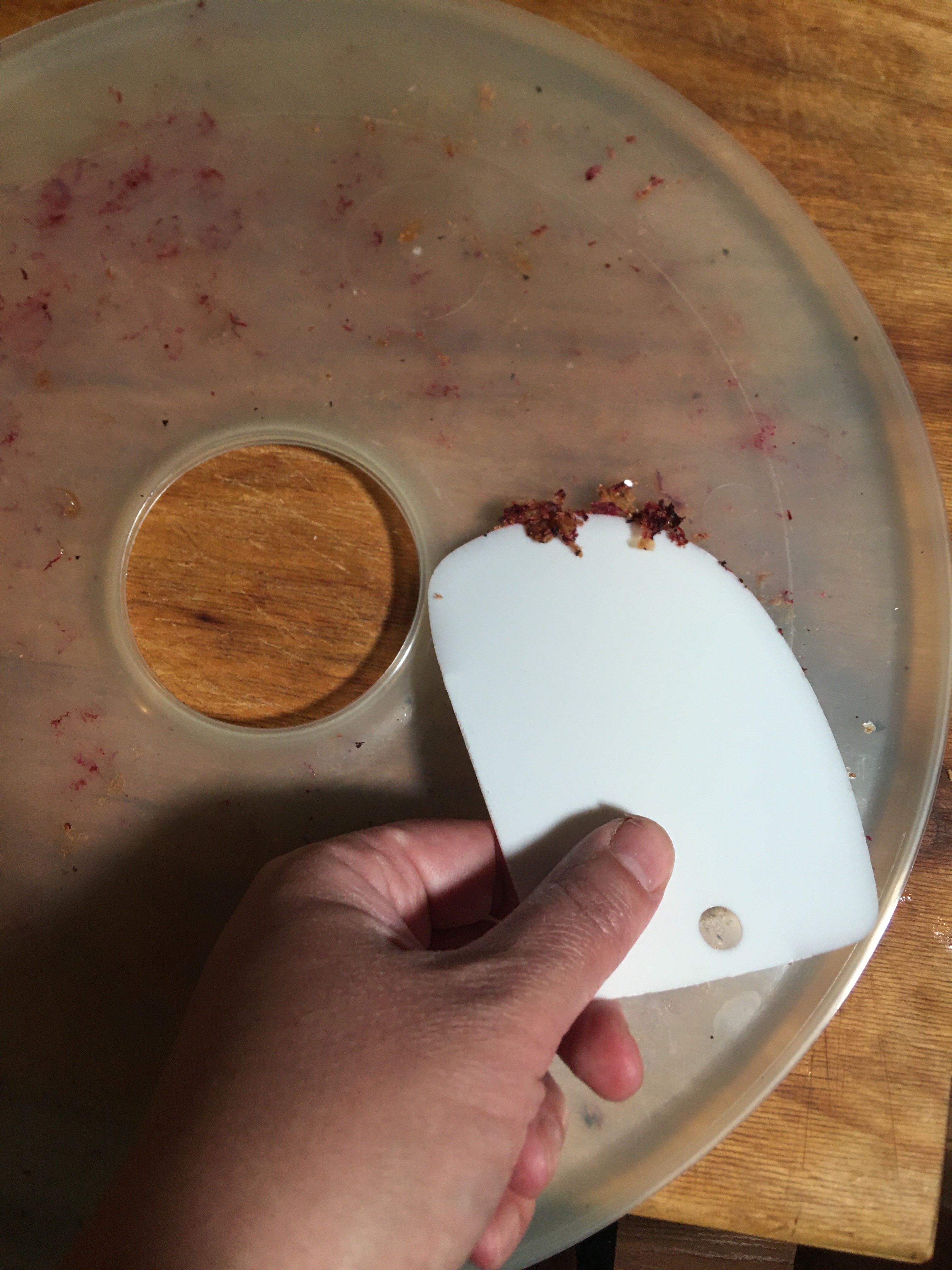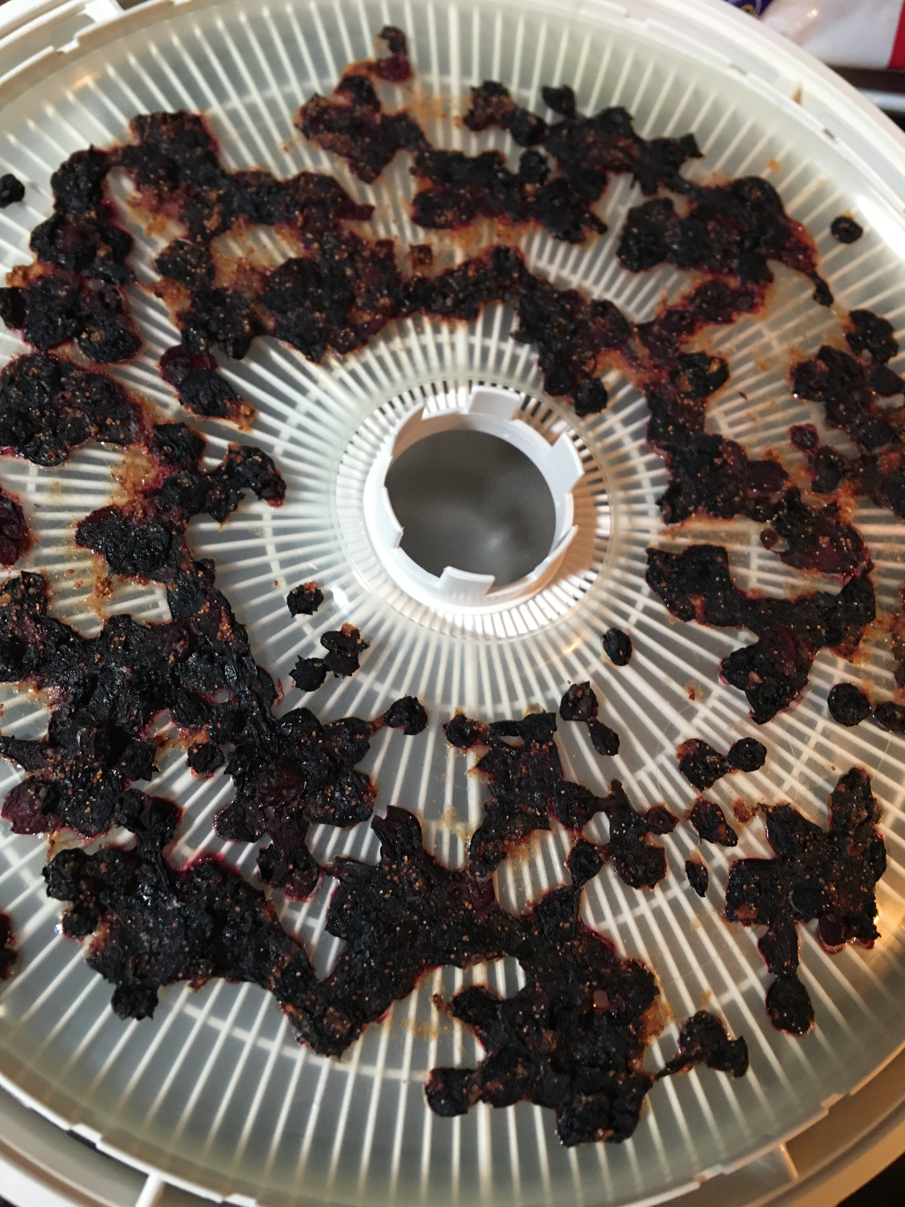 I run my dehydration temperature at 140-145°F until the broth is crispy like this. Dehydration time is going to vary depending on if you reduced your broth first, the temperature you dehydrate out, and most importantly the thickness of where your broth pools. The thicker sections will be gummy to touch until it’s properly dehydrated. The thinner bits you can leave as is. Or when you check on your progress, you can used a silicone spatula to push the thinner bits in closer to the thicker bits (this makes it easier to remove the thinner sections when you’re finished dehydrating).