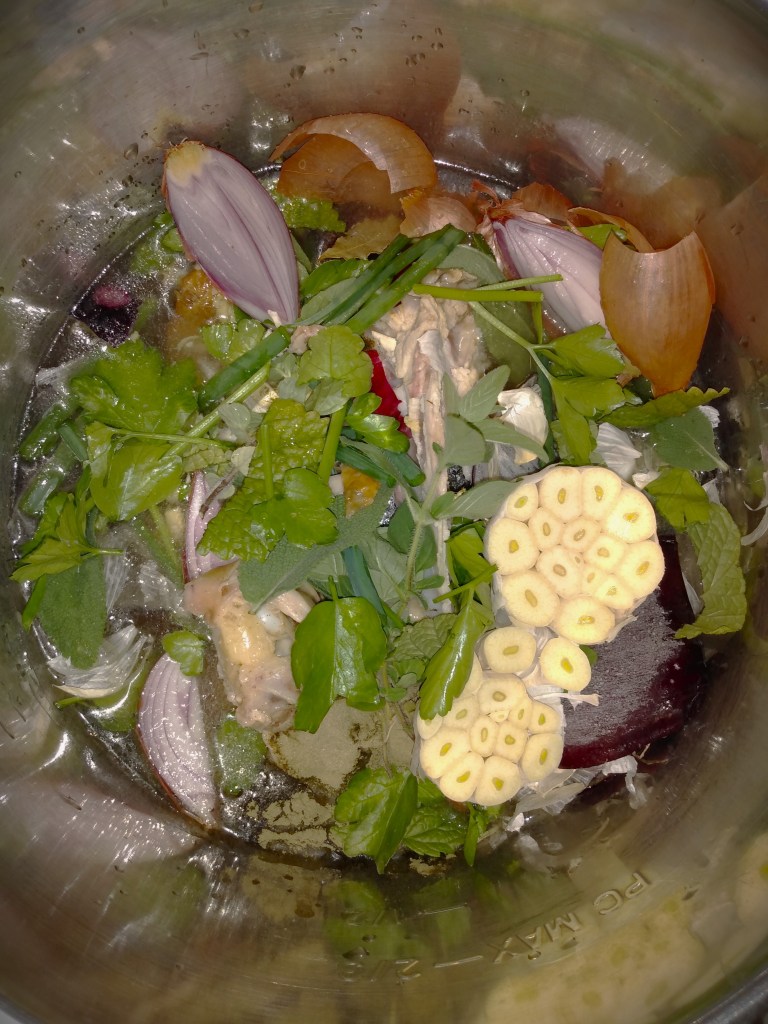 - the vegetable food scraps from my freezer (ideally I aim for the skins of about 4 onions, the skins of 2-4 garlic heads, half a bunch of leafy herbs)