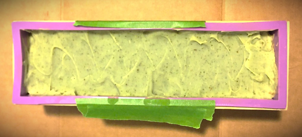 At this point the soap was so thick from seizing and still being worked that I only had a few minutes before complete loss. And I didn’t even have time to stop and put in my scent. So I stopped and immediately transferred into my individual soap molds and my loaf mold.