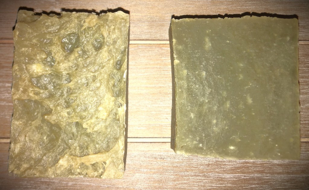 As I walk back through all that happened, I’m actually still surprised by how things worked out in the end, having dealt with broken soap and fixing it until it seized. When you look at these pictures you will see that the bar on the left (the soap I put in individual molds) definitely show the war that took place. However the bar on the right (cut from the loaf mold) looks like the only issue was minor cosmetic issues.